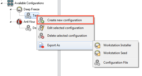 Deep Freeze Configuration Deep Freeze Configuration is a group of settings that defines the behavior of Deep Freeze on the workstation. Deep Freeze Configurations can be created and applied through the Deep Freeze Console. Complete the following steps to create a Deep Freeze configuration: 1. Launch Deep Freeze Console. 2. Go to Network and Groups > Available Configurations > Deep Freeze. 3. Right-click and select Create New Configuration. 4. Select or specify the settings for each tab as described in Using Deep Freeze Enterprise Configuration Administrator. 5. Specify the name of the configuration and click OK. 6. Optionally, select Export As > Workstation Seed or Export As > Workstation Installer from the drop-down to export the configuration. 7. Click OK.