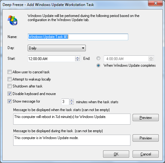 In the above screen, a Windows Update task has been created to perform Windows Updates at the computer daily at 12:00 AM and end when Windows Update completes. The task is configured to display a message to the user before Windows Update. The keyboard and mouse are disabled.