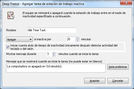 3. Haga clic en Aceptar.En la pantalla que se muestra arriba, se ha configurado la tarea de tiempo de inactividad para reiniciar el equipo cuando esté inactivo durante 1 minuto. Se mostrará un mensaje al usuario durante 1 minuto después de que transcurra el tiempo de inactividad. El equipo se reiniciará a menos que el usuario cancele la tarea en el cuadro de diálogo mostrado.