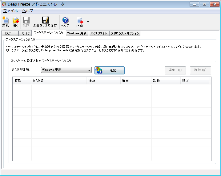 クライアントタスクタブ [クライアントタスク]タブでは、クライアントコンピュータで実行するさまざまなタスクをスケジュール設定できます。クライアントタスクは、クライアントに常駐して、クライアントのネットワーク接続が切断されたり、Deep Freezeコンソールと通信できなくても、実行されます。クライアントタスクは、クライアント用インストールファイルまたはDeep Freeze設定ファイル(.rdx)の一部です。次のクライアントタスクがあります。 • Windows Update – Windowsの更新プログラムをスケジュール設定します。[Windows Update]タブで追加設定を行えます。 • 再起動 – 定期的にクライアントを再起動して、元の設定に戻すか、不必要なデータを消去します。 • シャットダウン – 毎日指定した時間にクライアントをシャットダウンして、電力を節約します。 • アイドル時間 – 指定した期間クライアントが使用されていないと、シャットダウンまたは再起動します。 • バッチファイル – ターゲットクライアントでバッチファイルを実行します。[バッチファイル]タブで追加設定を行えます。 • Thawed Period – 指定した時間にThawedモードで再起動し、手動のソフトウェアインストール、サードパーティのツールを使った自動ソフトウェアインストール、またはその他の永久的な設定変更を実行できます。 各タスクについては、次のセクションで詳述します。 クライアントタスクとスケジュール設定されたタスク: Enterpriseコンソールとターゲットコンピュータとの通信に失敗しても、クライアントタスクはターゲットコンピュータに存在するため、実行されます。 Deep Freeze Enterpriseコンソールのスケジュールタスクウィザードを使ってスケジュールされたタスクは、ターゲットコンピュータではなくコンソールに存在します。そのため、スケジュールされたタスクが実行されるには、コンソールとターゲットコンピュータの間で継続的な接続が必要となります。詳細は、[Deep Freeze タスクのスケジュール設定]のセクションを参照してください。 [クライアントタスク]タブを使って重複するタスクを作成することはできません。作成したばかりのタスクが既存のタスクと重複する場合は、メッセージが表示されます。 メッセージは最長で5分間表示できます。2つのタスクの間隔は最低でも5分間開けなくてはいけません。 クライアントタスクは、Deep FreezeがFrozenモードのときにのみ開始します。
