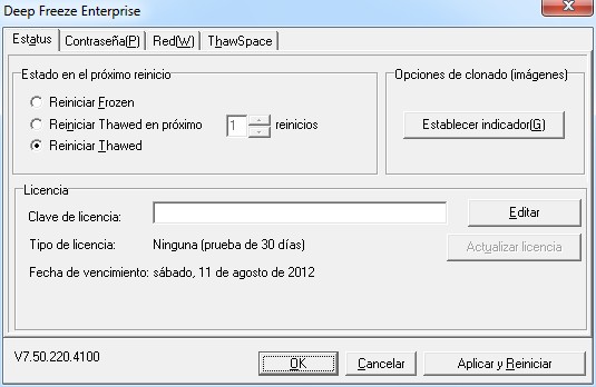 Deep Freeze debe estar preparado para implementarse antes de finalizar la imagen maestra. Para preparar la imagen maestra para la implementación, reinicie la computadora en estado Thawed e inicie sesión en Deep Freeze utilizando el acceso directo CTRL+SHIFT+ALT+F6. Seleccione la ficha Clonar y haga clic en Establecer indicador.Para regresar al estado Frozen después de la creación de la imagen, configure Deep Freeze para reiniciar en estado Thawed los próximos nreinicios (en la imagen maestra). De esa manera, después de ncantidad de reinicios, la computadora entra en estado Frozen en forma automática. También puede utilizar el Control de la línea de comandos de Deep Freeze para poner las computadoras seleccionadas en estado Frozen.