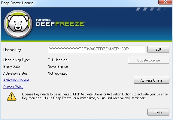 6. Click Activate Online to activate Deep Freeze License via the Internet. The computer must be connected to the Internet to Activate Online. The Deep Freeze License must be activated within 30 days of installation failing which Deep Freeze will stop functioning. During activation, the Deep Freeze License is authenticated with Faronics.