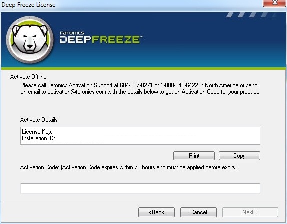 8. Send the Activate Details to Faronics Activation Support via phone or email. Once you receive the Activation Code from Faronics, enter it in the Activation Code field and click Next. Deep Freeze Licence is now activated.