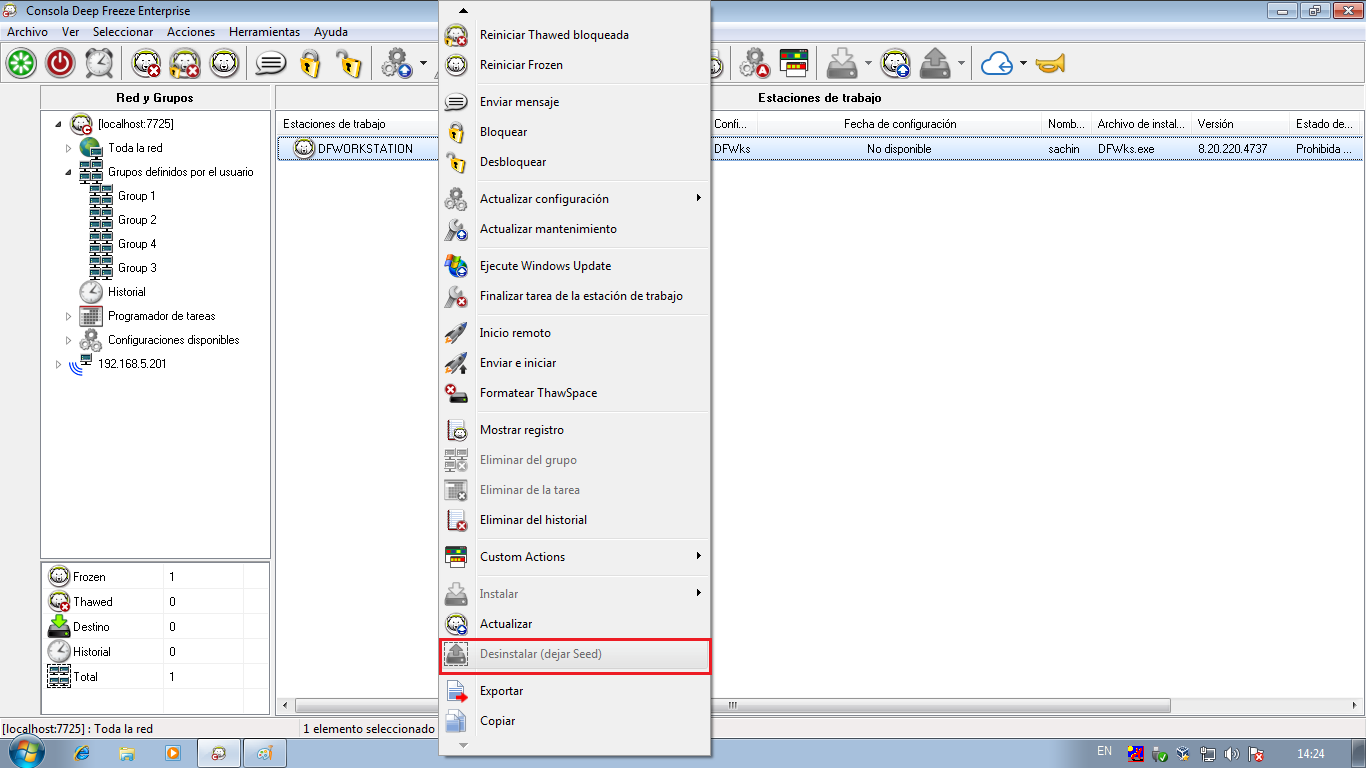 Para desinstalar Deep Freeze de un equipo y dejar la semilla de estación de trabajo, haga clic con el botón secundario en las estaciones de trabajo en modo Descongelado y seleccione Desinstalar (Dejar semilla), como se muestra arriba. O haga clic en el icono de la barra de herramientas.Para desinstalar por completo Deep Freeze y la semilla de estación de trabajo, seleccione los equipos que desea desinstalar y haga clic en el icono Desinstalar de la barra de herramientas.