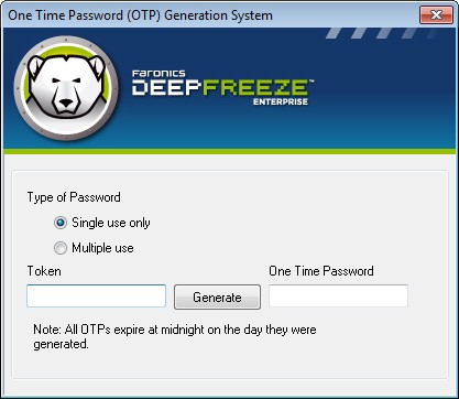 • Tools>One Time Passwords in the Enterprise Console. For more information refer to Using Deep Freeze Enterprise Console.