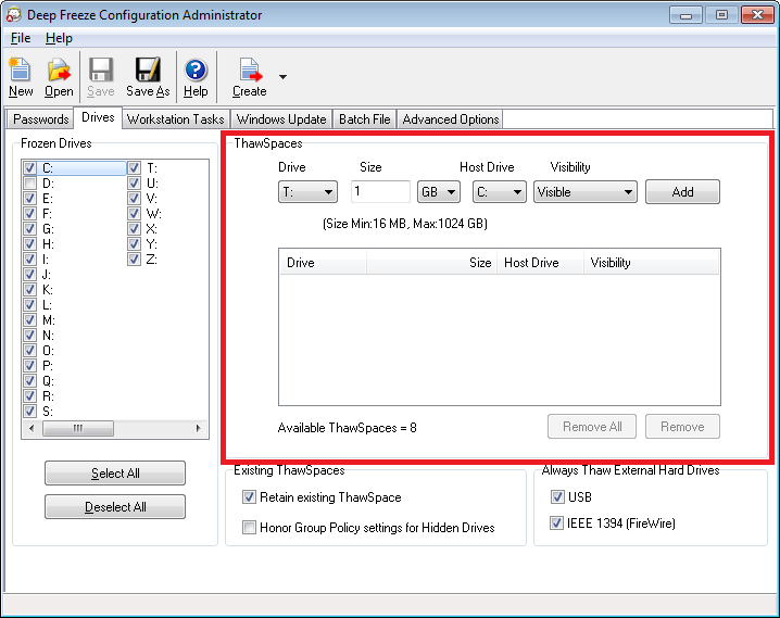 6. Click Add to add the ThawSpace.To remove a ThawSpace, select the ThawSpace and click Remove. The ThawSpace is removed and the drive letter is now added back to the Drive Letter drop-down. Click Remove All to remove all the ThawSpaces.
