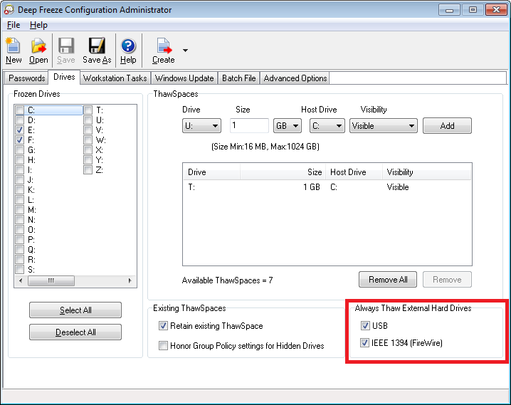 IEEE 1394 (FireWire) and both check boxes are selected by default. This ensures that the USB or IEEE 1394 (FireWire) hard drives are always Thawed.