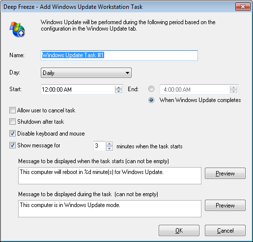 In the above screen, a Windows Update task has been created to perform Windows Updates at the computer daily at 12:00 AM and end when Windows Update completes. The task is configured to display a message to the user before Windows Update. The keyboard and mouse are disabled.