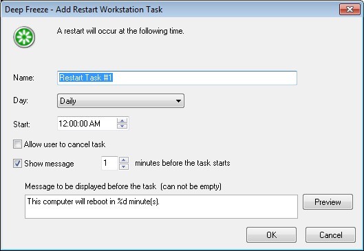 The message This computer will reboot in %d seconds is displayed in the Message to be displayed before the task field. This message can be edited. Add the word minutes in the message after %d to include the word minutes as part of the message.