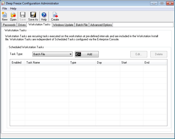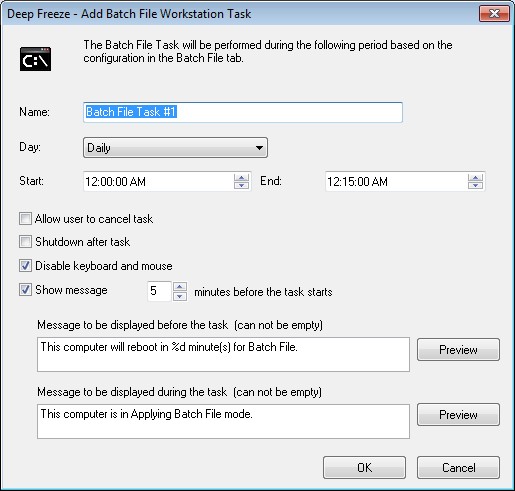 Batch File tasks are scheduled for executing batch files on the workstation. A Batch File task has a Start Time and an End Time. During this period, the batch file is executed on the workstation. You must configure additional settings in the Batch File tab for the Batch File Task to work. You can configure to shutdown the workstation after the Batch File Task is completed. Workstations will reboot Frozen after the batch file has been executed.