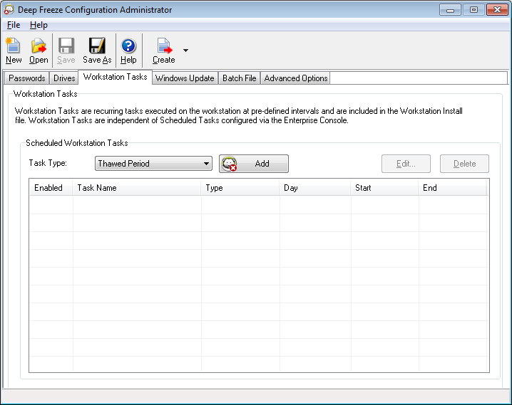 Faronics Anti-Virus: Faronics Anti-Virus works with Deep Freeze and does not require a Thawed Period task for updating virus definitions. Faronics Anti-Virus can update virus definitions even when the computers managed by Deep Freeze are in a Frozen state.Other Anti-Virus Programs: All other Anti-Virus programs require scheduling a Thawed Period task to update virus definitions. Refer to your Anti-Virus program user guide for information on how the virus definitions are downloaded. Alternatively, virus definitions can be applied manually when the computers managed by Deep Freeze are in a Thawed state. You can also schedule a no user intervention install of your virus definitions through a Batch File Task.