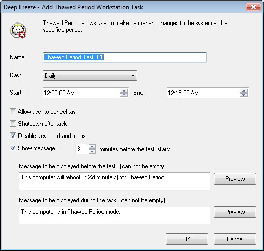 The message This computer will reboot in %d for Maintenance is displayed in the Message to be displayed before the task field. This message can be edited. Add the word minutes in the message after %d to include the word minutes as part of the message.In the above screen, a Thawed Period task has been created daily between 12:00 AM and 12:15 AM. The user is not allowed to cancel the task before it starts. The computer will shut down after the maintenance period. The keyboard and mouse are disabled during the maintenance period. The task is configured to display a message to the user 5 minutes before the task starts. The following message will be displayed on the computer at 11:55 AM The computer will reboot in 5 minutes to enter into a Thawed Period.To ensure that the virus definitions are applied permanently, schedule the virus definition update for your Anti-Virus program so that it starts after Deep Freeze successfully starts the Thawed Period task and ends before Deep Freeze ends the Thawed Period task. This ensures that the virus definitions downloaded and updated by the Anti-Virus program stay permanently on the system. Hence the system is fully protected by Anti-Virus and Deep Freeze.