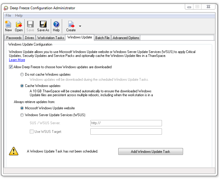 — Cache Windows updates —select this option to download when the workstation is in a Frozen or Thawed state and install during the Windows Update Task. This option creates a 10 GB ThawSpace (for version 8.35 or higher) and the Windows Updates are stored in the ThawSpace to ensure that Windows Update files are persistent across multiple reboots.