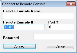 2. In the Connect to Remote Console dialog, specify the connection details such as Remote Console Name, Remote Console IP, Port number, and Password. This information is provided by the administrator of the host Console. Once entered, this information can be retrieved by right-clicking a port in the Network and Groups Pane and selecting Properties.