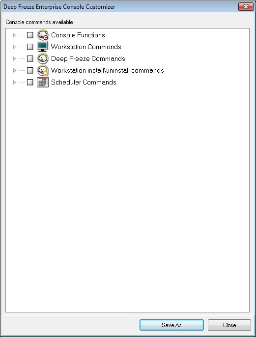 Select or clear the individual check boxes as required. Alternatively, select or clear the entire categories at once. Settings that are cleared will not be available in the new Enterprise Console you create. For an example on how to use the Console Customizer in a practical scenario, refer to Appendix D.