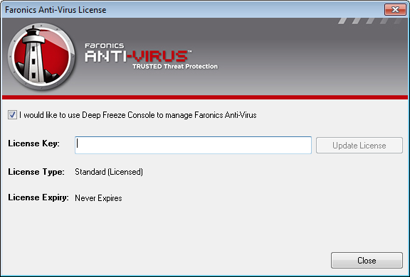 Disable Faronics Anti-Virus from the Enterprise Console Anti-Virus can be disabled on the Deep Freeze Console in case it is not required to be used. Complete the following steps to disable Faronics Anti-Virus from the Deep Freeze Console: 1. Go to Tools > Licensing > Faronics Anti-Virus License. 2. Clear the I would like to use Deep Freeze Console to manage Faronics Anti-Virus check box. 3. Click Close. 4. Restart the Enterprise Console for the settings to take affect.