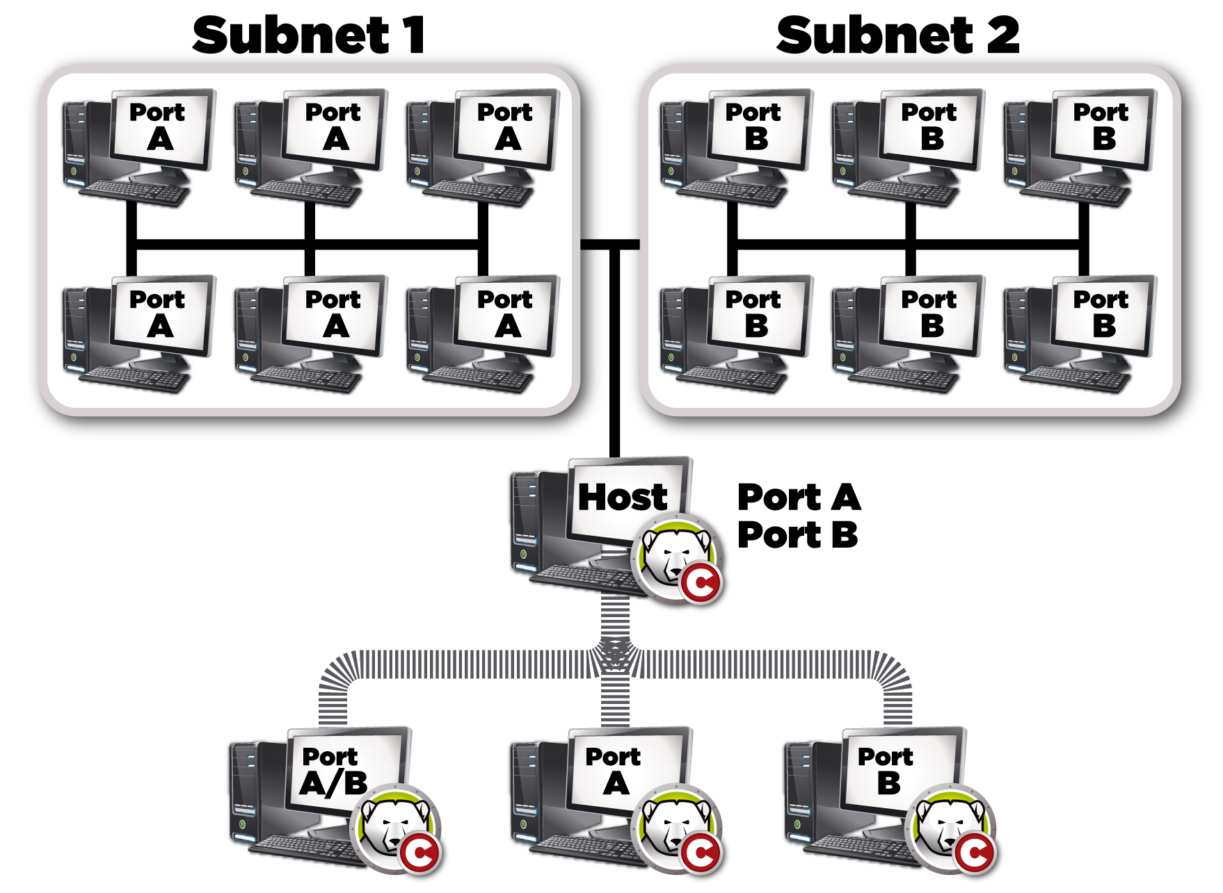 Example 3 - Multiple Ports, Console Accessed Remotely In this environment the clients are again located across multiple ports. In this case, more than one Console is being used. Multiple Consoles are accessed using a local service whose administrator (host) has released the connection information. The following diagram shows the network topology: In this scenario, the host has set up a connection using the local service. Looking at the above diagram, three other Consoles connect to the host in order to see the clients according to their ports. The Consoles do not have to be a part of individual subnets as long as they can see the host. More specifically, The Console connected through port A/B can see the host Console as well as each individual computer assigned to ports A and B. The other Consoles connected through port B can see the host and only the computers assigned to port B.