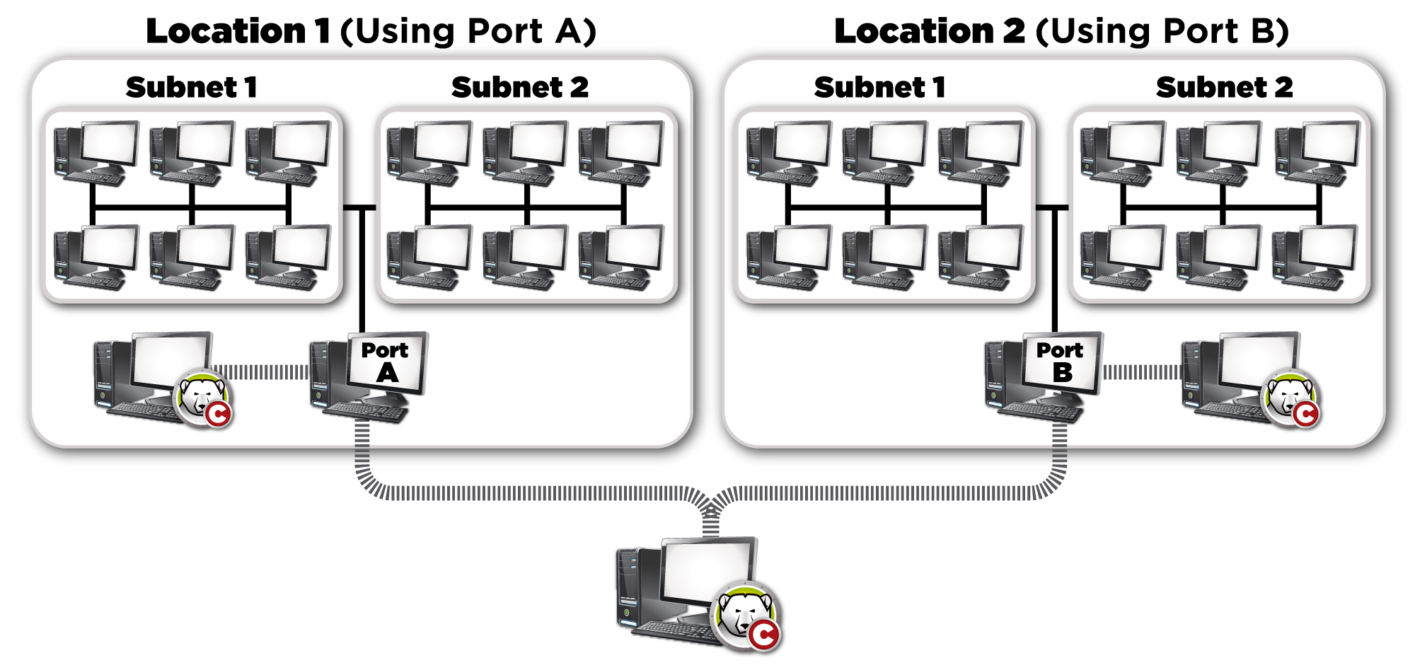 Example 4 - Multiple Subnets Multiple local services In this example, there are two separate locations. The following is a list of assumptions that are made regarding this particular example: • the locations are spread apart and have only a minimal connection to each other • there is a network administrator at each location who is responsible for looking after Deep Freeze at that location • both locations need to be administered from a third location In this example, the Remote Consoles are set up at each location and a local service is used: • Location 1 (a computer lab on campus) uses port A to communicate with the clients and the connections hosted by the Console. The school library’s computers use port B. The Console in the technical support department uses the connections hosted by both lab and library Consoles. • Any console not directly communicating with a computer should have the local service turned off. The following diagram shows the network topology: The benefit of this setup is that it allows all the packets sent from the clients in Location 1 to be contained at that location. The less distance a packet must travel, the less chance there is of the packet failing. The administrator in the lab can connect to the local service in the same location 1 but cannot connect to the local service in the library. The reason for this is that the lab administrator does not know the password to access the local service for the library. The same goes for the administrator in the library. If technical support knows the password to both local services (lab and library) the local service at both locations can be connected to, in order to administer all the clients.