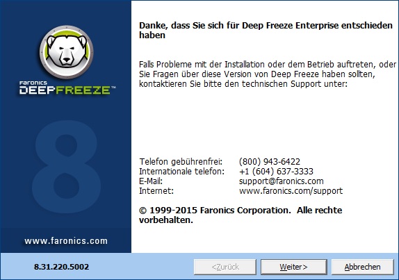 3. Geben Sie den Lizenzschlüssel in das Feld Lizenzschlüssel ein, oder markieren Sie das Kontrollkästchen Probeversion verwenden, um die Installation im Probemodus durchzuführen. Klicken Sie auf Weiter. (Deep Freeze aktiviert die Arbeitsplatzlizenzen automatisch. Deep Freeze muss innerhalb von 30 Tagen aktiviert werden, um zu vermeiden, dass das Produkt abläuft.)
