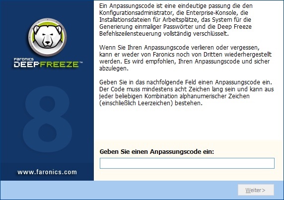 6. Geben Sie den Customization Code an, und klicken Sie auf Weiter. Der Customization Code muss mindestens acht Zeichen umfassen.