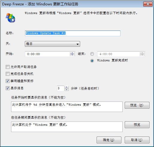 工作站上为下载 Windows 更新而计划 Windows 更新任务。即使工作站处于 Frozen 状态,也可以下载 Windows 更新。Windows 更新任务有起始时间结束时间选项。下载 Windows 更新以后,处于 Thawed 状态的工作站将重启并应用该更新。