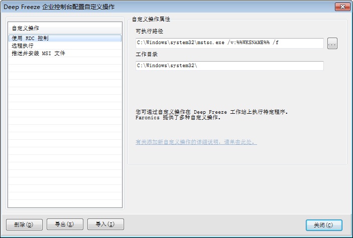 使用 RDC 控制 允许通过 Microsoft 远程桌面协议连接到计算机。必须已经在目标计算机上启用了远程桌面连接。 1. 单击操作 > 自定义操作。 2. 选择使用 RDC 控制。 3. 输入可执行路径,或浏览并选择位置。 4. 输入工作目录。 5. 单击应用。