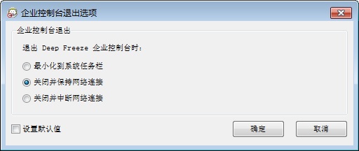关闭 Deep Freeze 企业控制台 若要关闭 Deep Freeze 控制台,请选择文件 > 退出,或单击关闭窗口按钮。退出时可选择: • 最小化控制台到系统任务栏。 此操作不会停止控制台,同时使连接保持活动状态。Deep Freeze 控制台图标将出现在系统任务栏中。此时计划的任务仍将执行。若要重新打开 Deep Freeze 企业控制台,请右键单击任务栏上的控制台图标并选择还原 Deep Freeze 控制台。 • 关闭 Deep Freeze 控制台并保持网络连接运行 此操作将关闭控制台,但与计算机的连接仍保持活动状态。此时计划的任务仍将执行。 • 关闭 Deep Freeze 控制台并关闭网络连接。 此操作将停止控制台进程并关闭连接(包括本地服务),计划的任务将不会开始执行。然而,已经开始执行的计划任务将继续执行。 选中设置默认值选项后,下次退出时将不再显示对话框。若要编辑这些设置,请选择工具 > 退出选项。