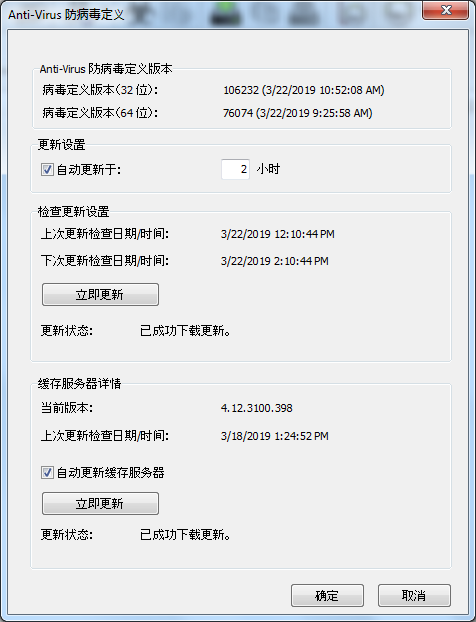 更新 Anti-Virus 防病毒定义 Anti-Virus 防病毒定义服务器随 Faronics Anti-Virus 一起安装在装有 Deep Freeze 控制台的同一台计算机上。Anti-Virus 防病毒定义服务器下载最新的病毒定义并分发到 Deep Freeze 管理的工作站。 要更新病毒定义,请完成以下步骤: 1. 启动 Deep Freeze 控制台。 2. 转到工具 > Anti-Virus 防病毒定义。 3. 可用的设置和操作如下: > Anti-Virus 防病毒定义版本 – 显示当前的 Anti-Virus 防病毒定义版本。 > 更新设置 – 选中自动更新于复选框,并输入以小时为单位的值。 > 检查更新设置 – 显示上次更新检查的日期/时间和下次更新检查的日期/时间。单击立即更新以立即更新病毒定义。显示更新状态。 > 缓存服务器详情 – 显示当前版本和上次更新检查的日期/时间。如果您要自动下载并更新包含最新定义的缓存服务器,请选中自动更新缓存服务器复选框。单击立即更新以立即更新缓存服务器。 4. 单击确定。