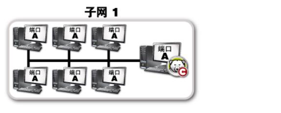 示例 1 – 单个子网 在此环境中,所有客户端计算机均作为控制台计算机位于同一子网中。此环境并不需要远程控制的控制台(虽然也可以使用此类控制台)。此示例未使用远程控制台。这是一个最简单的网络环境,配置起来也最为容易。 下图所示为网络拓扑结构: 客户端计算机(以计算机图标标识)与 Deep Freeze 企业控制台计算机(以 Deep Freeze 控制台图标标识)位于同一子网内。 在此方案中,客户端使用端口 A,同时控制台在同一端口建立了一个本地服务连接。在创建工作站安装文件或工作站种子之前,已在高级选项选项卡上配置了此端口。