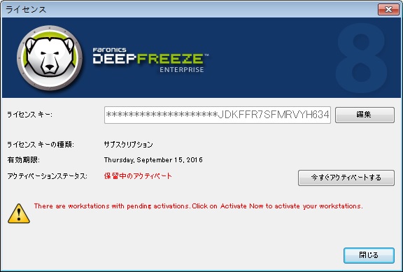 ライセンス ライセンスキーはDeep Freeze Enterprise Consoleから更新することができ、ワークステーションのライセンスは自動または手動のいずれかでアクティベートできます。 Deep Freezeワークステーションのライセンスを自動的にアクティベートするには、次の手順を実行します。 1. Deep Freeze Enterprise Consoleを起動します。 2. [ツール] > [ライセンス]を選択します。 3. [ライセンス]ダイアログが表示されます。 4. [編集]をクリックし、[ライセンスキー]フィールドにライセンスキーを入力します。 5. [ライセンスの更新]をクリックします。これにより、Deep Freezeは評価版からライセンス許諾版になります。[ライセンスキーの種類]フィールドにライセンスの種類が表示されます。[有効期限]にライセンスの有効期限が終了する日時が表示されます。 Deep Freezeは、Enterprise Consoleから、またはFaronics License Activation Serverに直接接続して、各ワークステーションのライセンスを自動的にアクティベートします。 お使いの製品が正規品であることを証明し、有効期限の終了を避けるために、製品のライセンスをアクティベートする必要があります。搭載されたDeep Freezeが30日以内にアクティベートされなかった場合、そのワークステーションを保護状態にすることはできません。 ワークステーションは、ローカルのコンソールから、または直接Faronics Activation Serverに接続し、インターネットへの接続が利用可能になると、お使いのコンピュータに関連する情報(製品のバージョン、ライセンスキー、マシンのID、OSのバージョン、MACアドレス、CPUのID、コンソールマシンのIDなど)をセキュアなサーバーに送信します。