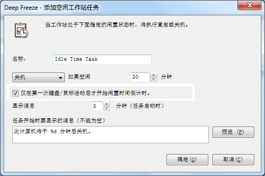 空闲时间 要计划空闲时间任务,请完成以下步骤: 1. 从任务类型下拉列表中选择空闲时间,并单击添加。 2. 此时将显示以下选项: > 名称 – 指定任务的名称。 > 重新启动或关机 – 选择重新启动或关机,并指定空闲时间(分钟),在此之后必须执行任务。 > 仅在第一次键盘/鼠标活动后才开始闲置时间倒计时 – 此选项仅适用于关机任务。选中此复选框后,计时器只会在第一次键盘/鼠标活动后才开始倒计时。例如,如果将闲置时间指定为 20 分钟,并且选择了此选项,则工作站任务将在第一次键盘和鼠标活动后 20 分钟关闭计算机。 > 显示消息 – 选中此复选框可显示一条消息。指定时间间隔(分钟)并输入一条简要消息。 启动计算机后,只有在首次敲击键盘或使用鼠标后,空闲时间计数器才会被激活。在远程桌面会话期间,控制计算机的空闲时间用于激活该任务。 3. 单击确定。 示例 在以上屏幕中,空闲时间任务设置为计算机在空闲 1 分钟后重新启动。在空闲时间达到设定值时,将向用户显示一条消息,显示时间持续 1 分钟。除非用户在显示的消息框中取消了该任务,否则计算机将会重新启动。