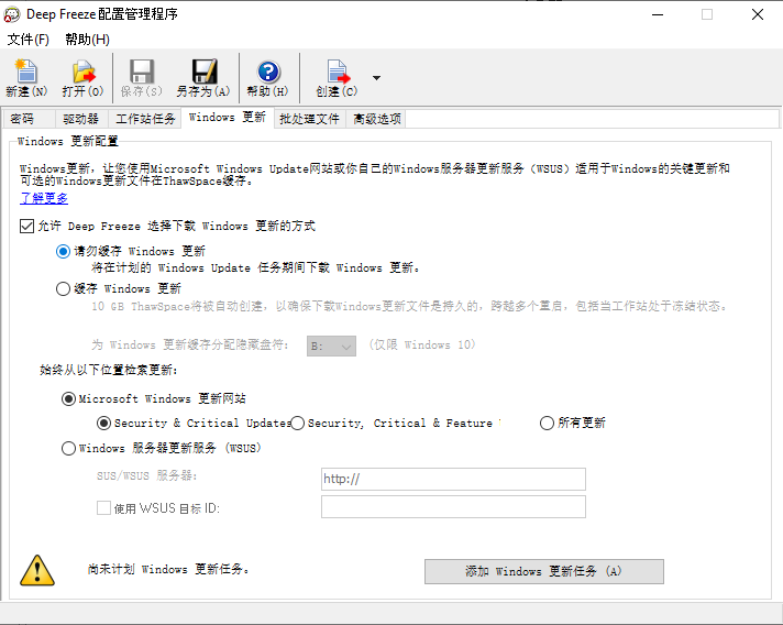 Deep FreezeWindows 更新选项卡将覆盖工作站上的 Windows 更新设置。Windows 更新选项卡中的设置可以自定义,如下所示:允许 Deep Freeze 选择下载 Windows 更新的方式— 选中复选框,允许 Deep Freeze 选择如何下载 Windows 更新。系统将显示以下选项:适用于 Windows 10 及以上版本:选择缓存 Windows 更新时,启用驱动器盘符下拉列表。从下拉菜单中选择一个驱动器盘符,分配为用于存储 Windows 更新缓存的隐藏驱动器盘符。为 Windows 更新缓存分配的隐藏驱动器盘符将在 Windows 资源管理器中不可见。