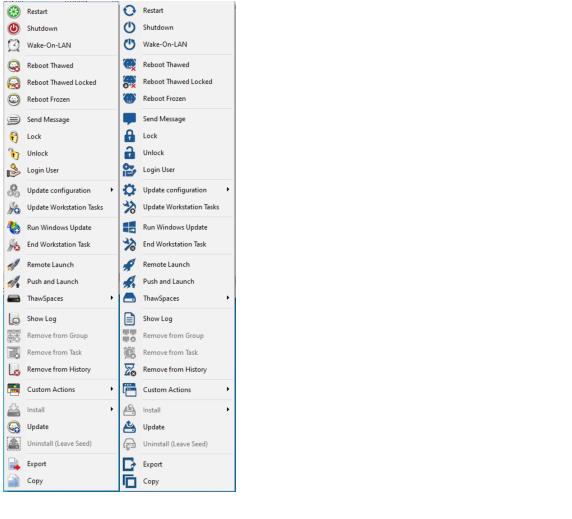 使用控制台管理 Deep Freeze 企业控制台包含一个位于屏幕顶部的工具栏,可用于快速访问控制台的各项功能。 转至视图 > 经典外观以采用经典 Windows 格式查看图标。 转至视图 > 现代外观以采用现代 Windows 格式查看图标。 也可以使用上下文菜单访问这些命令,如下所示;右键单击一个或多个计算机时将显示上下文菜单。当您选择一个特定操作时,所选计算机会执行该操作,同时状态图标也会相应更新。如果选择多个计算机,操作仅应用于适用计算机。例如,如果选择解冻和冻结的计算机并应用重启解冻操作,则将仅解冻冻结的计算机。此操作将不会应用于已解冻的计算机。 如果所选计算机不支持此操作,则某些特定的图标会被禁用。例如,一个具有目标图标的计算机无法显示解冻或冻结选项,因为程序尚未安装。