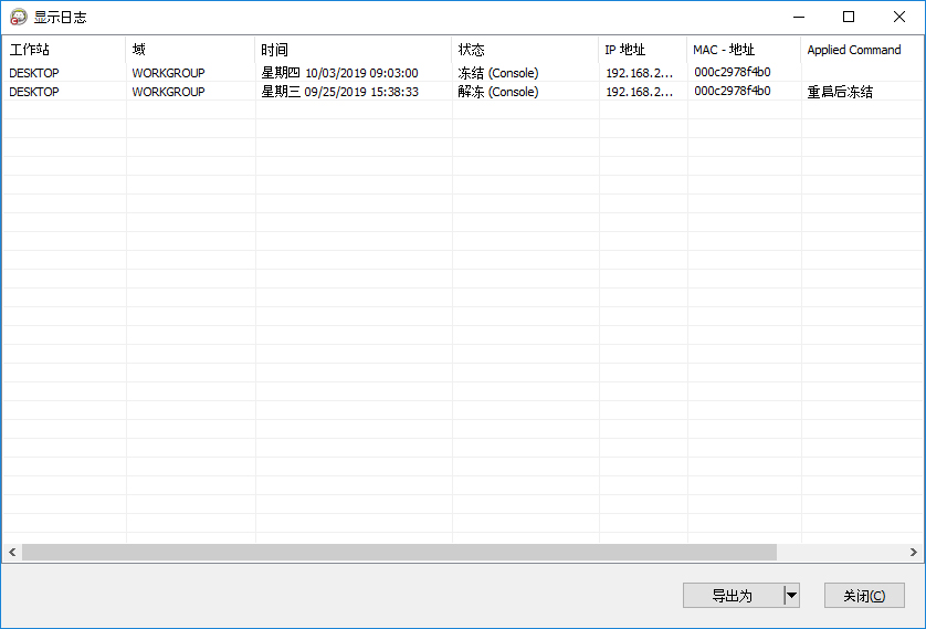 查看控制台日志文件 企业控制台将所有已连接计算机的状态和活动历史记录保存在一个日志中。该日志存储了过去 7 天的信息。超过 7 天的信息将自动从日志中删除。 • 若要查看一个或多个计算机的日志文件,请右键单击相应计算机并选择显示日志。 • 若要排序日志文件,请单击所需标题。可用的列如下: > 工作站 > 域 > 时间 > 状态 状态栏显示计算机的当前状态以及计算机的重启方式。 例如,如果计算机通过控制台重启为 Thawed 解冻状态,该状态将显示为Thawed 解冻(控制台)。 > IP 地址 > MAC 地址 > 应用的命令(Frozen 冻结,Thawed 解冻,重启,关闭) > 安装文件 • 要导出日志文件,请单击导出为并选择文本或CSV。指定文件名称并单击确定。