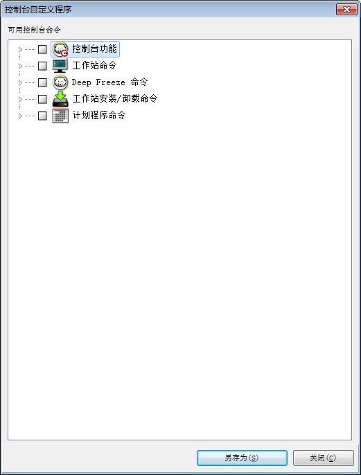 控制台自定义程序 使用控制台自定义程序,您可以指定可以在控制台中使用的功能和命令,并可将结果另存为一个新控制台,且该控制台可在组织中分发。 可用设置分组为不同类别(控制台功能,工作站命令,Deep Freeze 命令,工作站安装/卸载命令和计划程序命令)。单击每个类别左端的加号 (+) 图标,可显示该类别中可用设置的完整列表。 根据需要选择或清除各个复选框。或者,一次选择或清除所有类别。被清除的设置在您新建的企业控制台中不能使用。有关在实际情形下如何使用控制台自定义程序的示例,请参阅附录 D。 若要创建具有有限功能的控制台,请完成以下步骤: 1. 选择工具 > 控制台自定义程序。 2. 此时将显示控制台自定义程序。 3. 选择要在新控制台中显示的功能。 4. 单击另存为保存控制台。为文件指定名称。 5. 如果右键单击新建的 .exe 文件,则会启动具有有限功能的控制台。