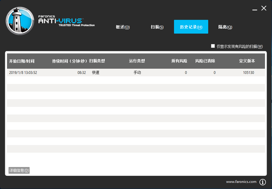 查看扫描历史记录 要查看扫描历史记录,请完成以下步骤: 1. 依次转至开始 > 程序 > Faronics > Anti-Virus Enterprise > Faronics Anti-Virus Enterprise。或者,您可以双击系统任务栏中的 Faronics Anti-Virus 图标。 2. 单击历史记录选项卡。 3. 选择以下操作: > 仅显示发现有风险的扫描 – 选择此选项仅查看发现有风险的扫描。 > 详细信息 – 选择某个条目,然后单击详细信息以查看扫描的详细信息。