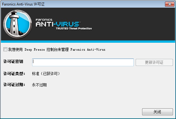从企业控制台禁用 Faronics Anti-Virus 如果无需使用 Anti-Virus,可以从企业控制台将其禁用。 要从 Deep Freeze 控制台禁用 Faronics Anti-Virus,请完成以下步骤: 1. 依次转至工具 > 许可 > Faronics Anti-Virus 许可证。 2. 取消选中我想使用 Deep Freeze 控制台来管理 Faronics Anti-Virus 复选框。 3. 单击关闭。 4. 重新启动企业控制台以使设置生效。