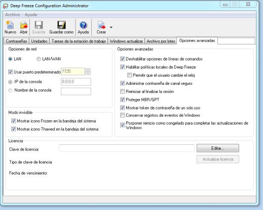 Ficha Opciones avanzadas La ficha Opciones avanzadas permite configurar los ajustes de red usados por los equipos para comunicarse con la consola, configurar diferentes opciones de seguridad y administrar las claves de licencia.