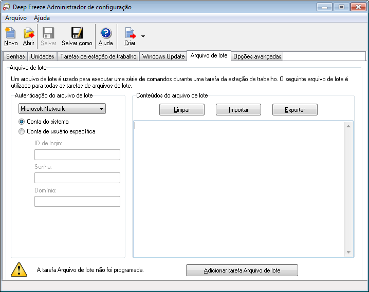 Guia Arquivo de lote A guia Arquivos de lote permite personalizar as configurações para a tarefa Arquivo de lote. Quando você agenda uma tarefa Arquivo de lote da guia Tarefas da estação de trabalho, você deve definir as configurações na guia Arquivo de lote. Configure as seguintes opções: • Autenticação do arquivo de lote Selecione Microsoft Network e selecione se a conta a ser usada é uma conta Sistema ou uma Conta de usuário especificada. Se você tiver selecionado Conta de usuário especificada, indique identificação de logon, senha e domínio. Para Rede Novell, selecione Novell, especifique a identificação de logon, senha, árvore, contexto e servidor. A configuração padrão que usa a autenticação Microsoft Network/conta Sistema deve ser testada antes de usar credenciais alternativas. Usar esta conta de nível de máquina frequentemente é suficiente para concluir a tarefa. O uso de uma conta de usuário especificada pode ser necessário se o arquivo de lote exigir acesso a recursos seguros. • Conteúdos do arquivo de lote Insira um arquivo de lote personalizado para ser executado durante a tarefa Arquivo de lote. O mesmo arquivo de lote se aplica a todas as tarefas Arquivo de lote. As seguintes opções estão disponíveis ao executar arquivos de lote personalizados: > Para limpar o arquivo de lote atual, clique em Limpar. > Para carregar um arquivo existente, clique em Importar e navegue até o local do arquivo. > Para salvar o conteúdo do campo, clique em Exportar e navegue and até o local preferido para salvar. O arquivo de lote pode ser qualquer comando ou série de comandos que o processador de comandos puder executar. Você pode executar scripts aleatórios que requerem o uso de um mecanismo de script de terceiros chamando o script a partir do arquivo de lote como se ele estivesse sendo executado a partir da linha de comando. Arquivos de lote permitem usar VB scripts, PowerShell scripts, Ninite e outras soluções de terceiros. Entre em contato com seu fornecedor de software ou consulte o guia do usuário da sua solução de terceiros para saber mais sobre soluções de script que incluem opções sem intervenção do usuário.