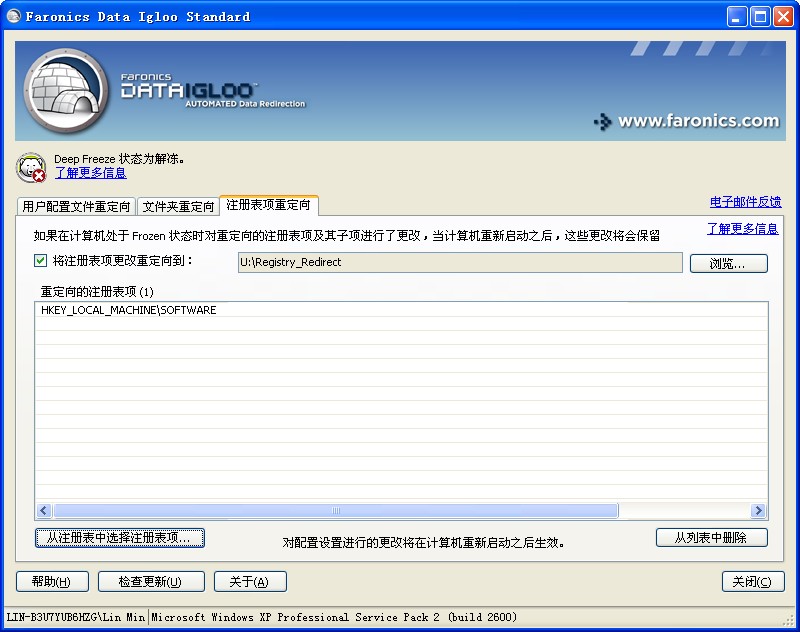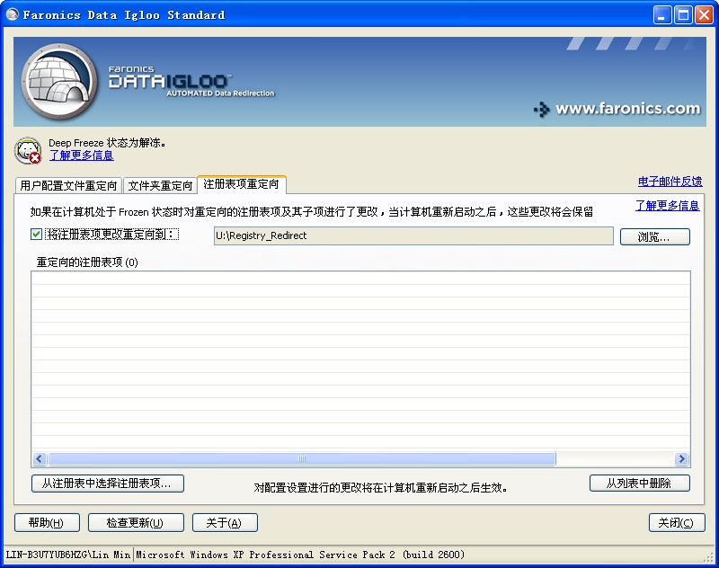 对配置所做的更改只有在重新启动计算机后才会应用。注册表项重定向只在计算机重启进入 Frozen 状态后才会生效。